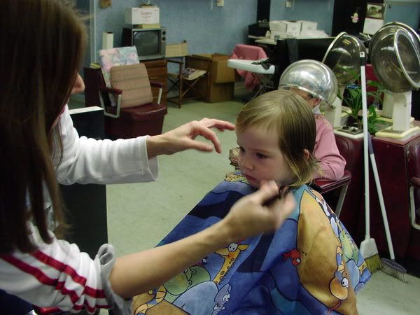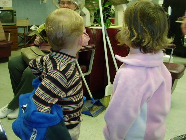 I was surprised at how serious and cooperative the kids were. This was one of those few situations where we were actually able to abide by our principles and let the kids call the shots about their bodies (unfortunately, I can't always follow that policy about diaper changes, since I feel a certain responsibility to remove poopy diapers at SOME point, and there are days when they would continue to wear them for hours in the absence of coercion). Anyway, it seems to have paid off. They were ready for this. Pat, the hairdresser, said that she has only had two other kids who were as cooperative.