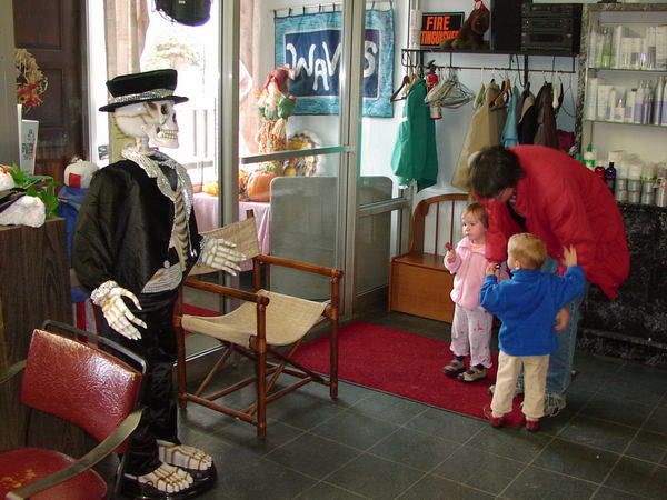 The hairdresser's shop had this funky skeleton that sang "Super Freak" when you walked next to it. The kids had a little dance party on the way out.